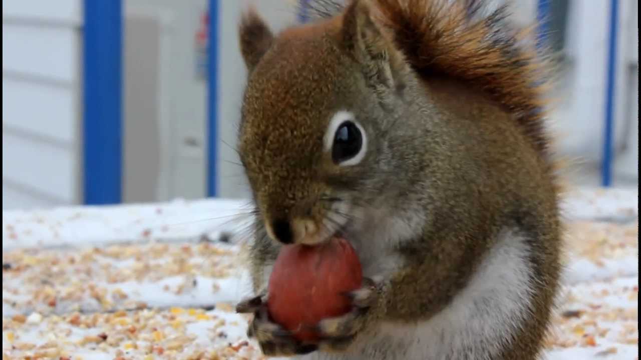 A young pine squirrel expresses his excitement with a symphony of adorable squeaks and chatters when a man gives him a nut to snack on.