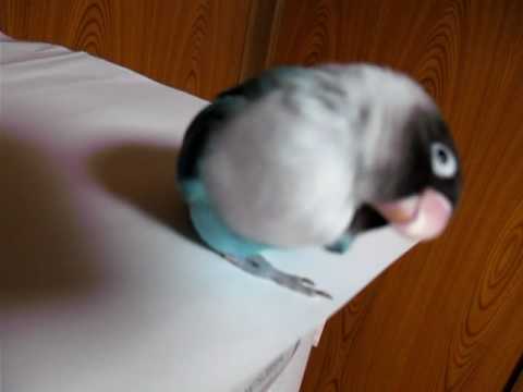 This cute blue-masked lovebird looks like a tiny Irish Riverdance dancer as she tap dances her way around the top of a refrigerator.
