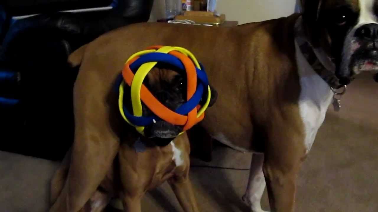 Sara the boxer dog insists on wearing her favorite ball on her head so she doesn’t have to share it with her big brother, Joe Joe.