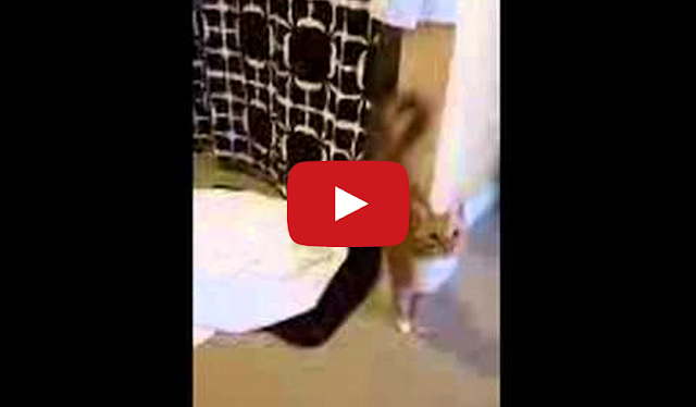 Whenever this woman starts to sing (she doesn’t sound that bad) her cute cat gets annoyed and hides behind a shower curtain.