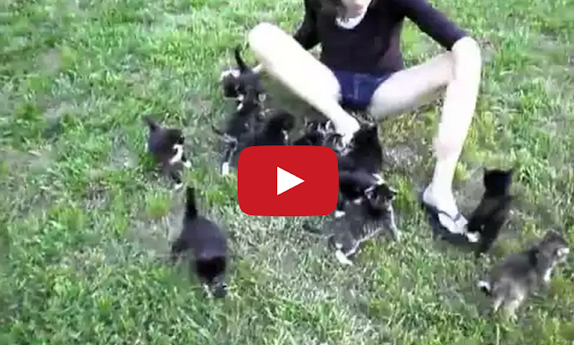 Climb Aboard the Kitten Train ByTastefully Offensive June 14, 2015 A litter of thirteen six-week-old kittens chase their human single file around a grassy yard. [stacy cuccia]