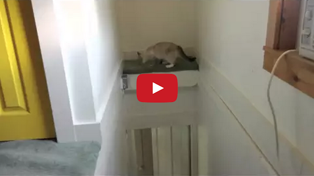 Delilah, a one-year-old lynx-point siamese cat, clumsily slips before making a physics-defying leap from her favorite hang out spot above the stairs.