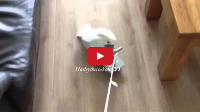 Harley the white cockatoo gets pulled around the house on her custom-made skateboard.