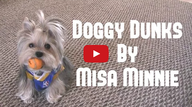 To celebrate tonight’s NBA championship game, Misa Minnie, the Yorkshire terrier, shows off her awesome basketball dunks while wearing a tiny Golden State Warriors jersey. Brody Brixton, the French bulldog puppy, looks adorable in his Cleveland Cavs jersey, but he needs to step up his defensive game.