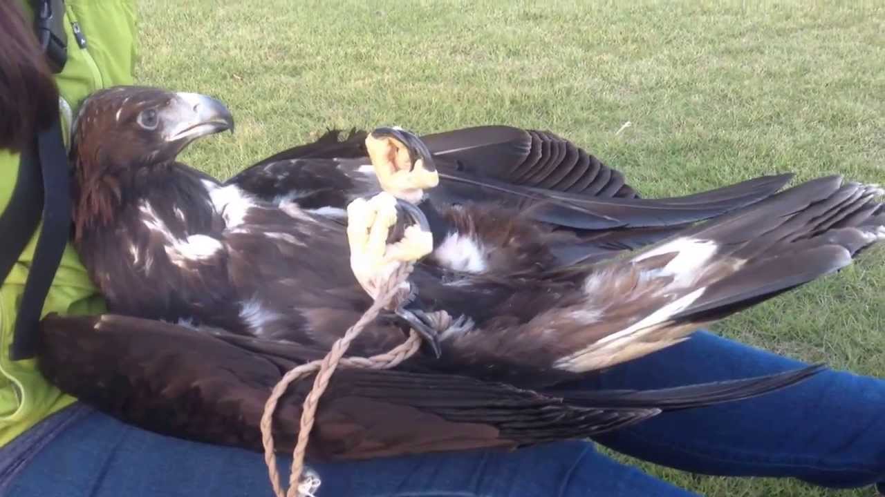 After spending the afternoon training, this fierce-looking golden eagle enjoys a relaxing belly and talon massage from his handler.