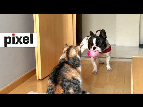 Pixel the French bulldog puppy bounces around in an attempt to get his feline housemate, Czika, to play with him, but Czika couldn’t care less about poor Pixel or his pig toy.