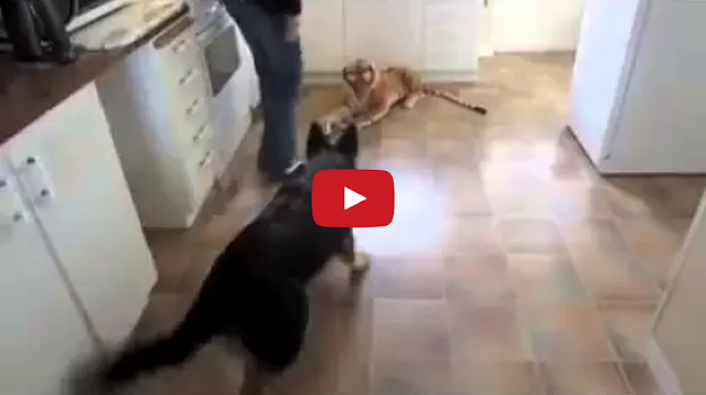 This poor German shepherd goes into defensive attack mode when his home gets invaded by realistic-looking stuffed tiger toy.