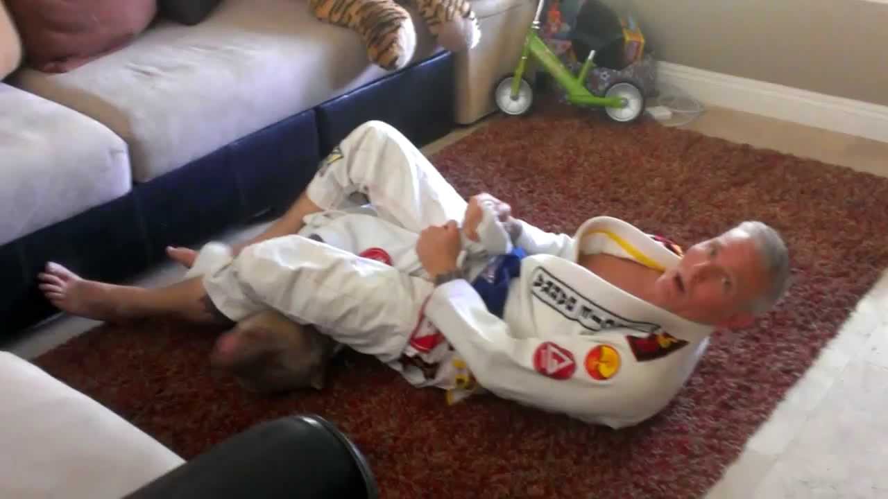Koa the pit bull patiently cooperates (I’m sure he loves the attention) while his human, Gene Cook, Jr., uses him as a dummy to demonstrate some fundamental Brazilian jiu-jitsu techniques.