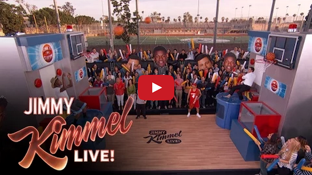 Jimmy Kimmel goes head to head with with Chicago Bulls’ all-star Jimmy Butler in a NBA basketball-themed version of a duel dunk tank game.