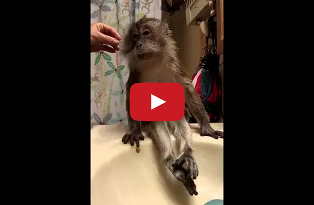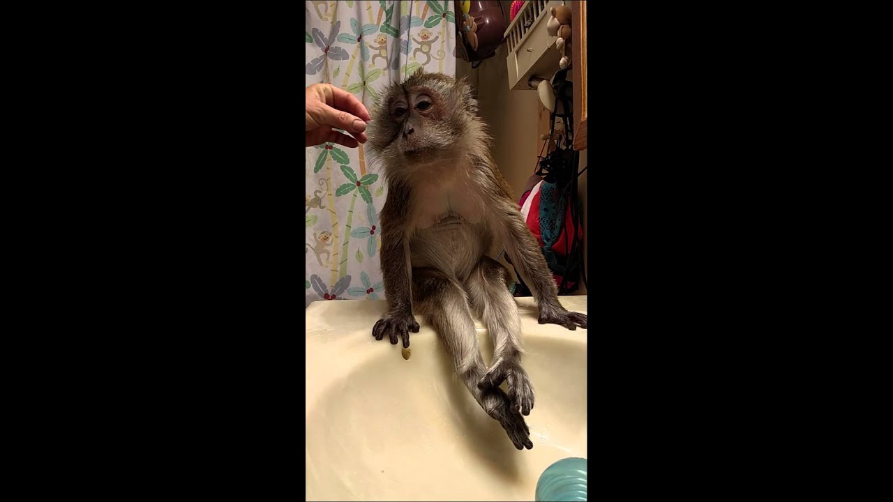 Angel, an 18-year-old long-tailed macaque monkey from the Misfitland animal shelter in Moscow, Ohio, calmly sits on a bathroom sink while getting pampered by her caretaker, Teresa Bullock.