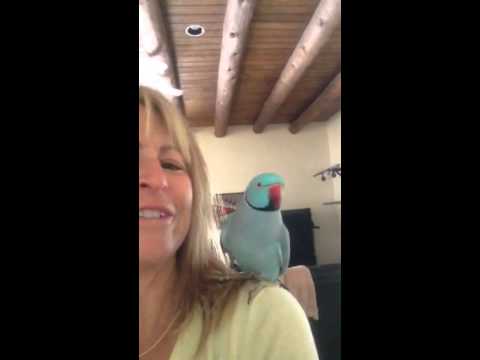 Marnie the Indian ring-necked parakeet flies over to her human’s shoulder for a chat.