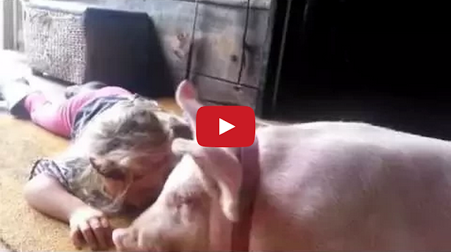 A young girl giggles uncontrollably while her pet pig, Bean, attempts to steal her headband.