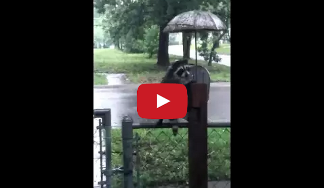 Raccoon Uses Umbrella to Stay Dry by Tastefully Offensive A woman from Topeka, Kansas spotted this young raccoon trying to avoid the rain under a small cement umbrella that covers her mailbox. [brieffect/via sayomg]