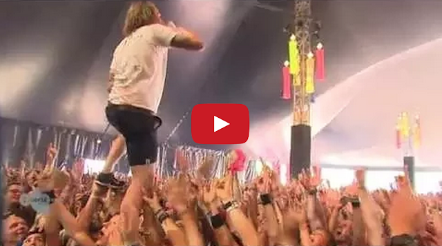 David Achter de Mole, the lead singer of the Dutch rock band John Coffey, casually catches and drinks a cup of beer that gets thrown in his direction while he’s crowdwalking at Pinkpop Festival 2015 at Megaland park in Landgraaf, Netherlands.