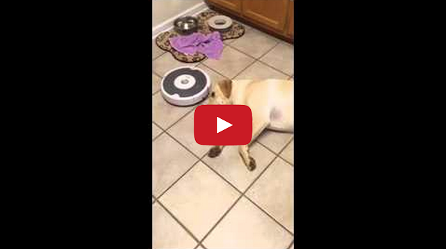 A autonomous robotic Roomba vacuum cleans the floor around a golden lab who’s too lazy to move out of the way.