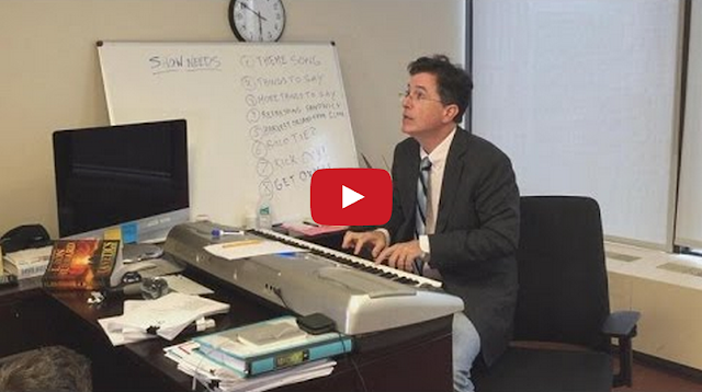 Stephen Colbert composes an original theme song jingle in preparation for taking over the hosting duties of the Late Show on September 8, 2015.