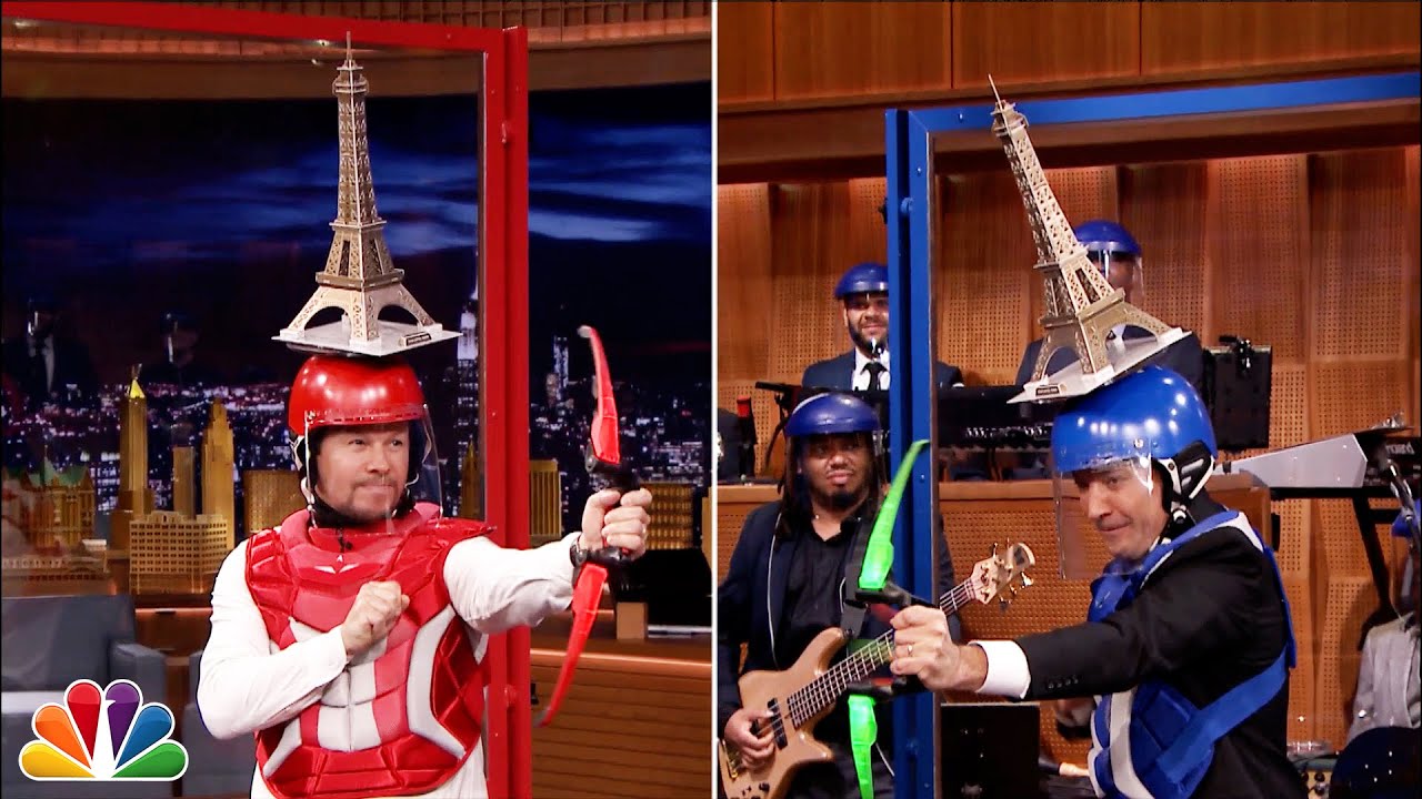 Tonight Show host Jimmy Fallon and Ted 2 star Mark Wahlberg take turns trying to shoot random objects off of each other’s heads with toy bows and arrows.