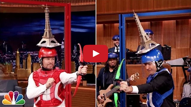 Tonight Show host Jimmy Fallon and Ted 2 star Mark Wahlberg take turns trying to shoot random objects off of each other’s heads with toy bows and arrows.
