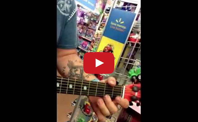 Clay Shelburn performs an impromptu cover of Stevie Ray Vaughan’s blues classic “Pride and Joy” on a cheaply made Walmart kid’s guitar while his friend Zac Stokes sings along.
