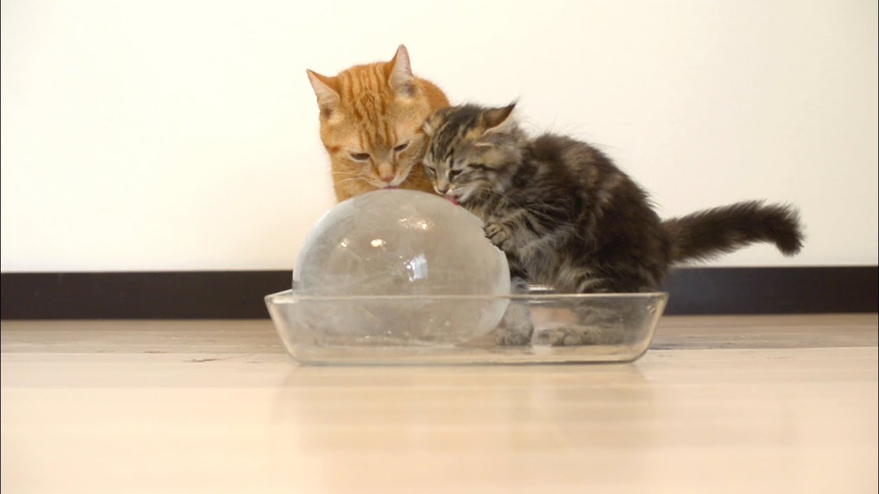 Ten cute cats have fun licking large ice balls, but the fun stops for one of the cats around the 45 second mark when he accidentally gets his paw wet.