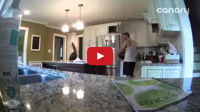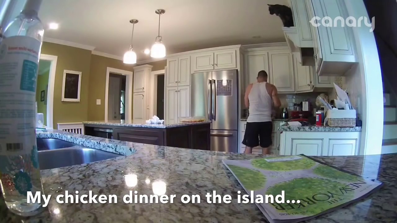 (PG-13 language) Jeremy Husted’s security camera captured footage of his cat leaping from the top of a cupboard onto his chicken dinner.