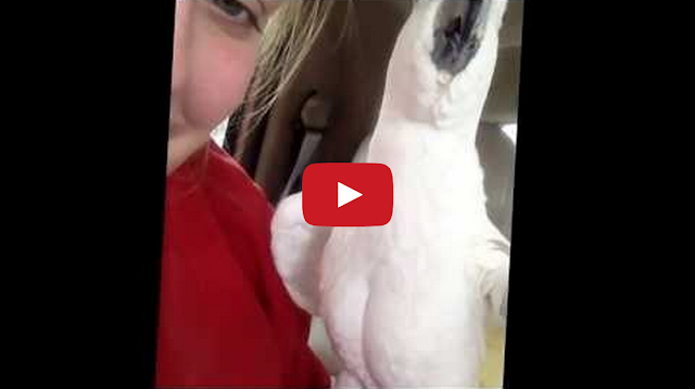 Abigail Aberegg plays a game of peek-a-boo with a silly sulfur-crested cockatoo.