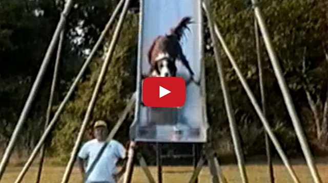 This brave border collie climbs a tall ladder all by himself to slide down a giant slide.
