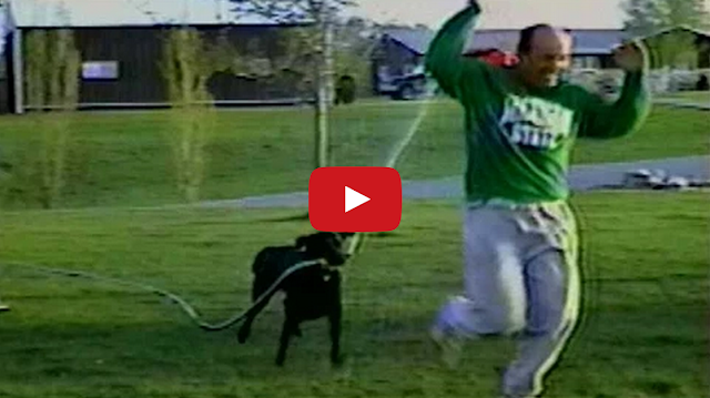 This clever black lab gets revenge for all the baths he’s been given by chasing down his human with a garden hose after stealing it from him.