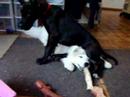Chopper the Great Dane puppy repeatedly tries to sit on Blitzen the Samoyed puppy’s head while Blitzen is just trying to chew on his bone in peace. In Chopper’s defense, Blitzen does kind of look like a comfy white pillow.