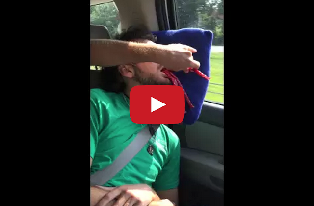 (PG-13 language) While on a road trip, a group of friends pranked their sleeping friend Micah by fitting ten Twizzler licorice twists into his open mouth.