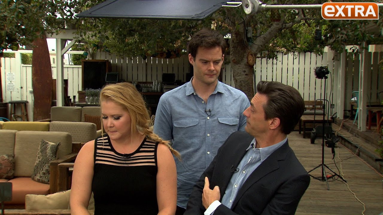 (PG-13 content) Extra‘s Terri Seymour got an unexpected substitute, Mad Men‘s Jon Hamm, when she sat down to interview Amy Schumer and Bill Hader about their upcoming romantic comedy film, Trainwreck.