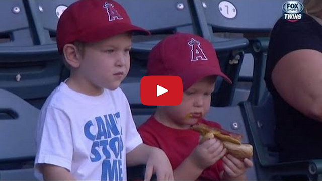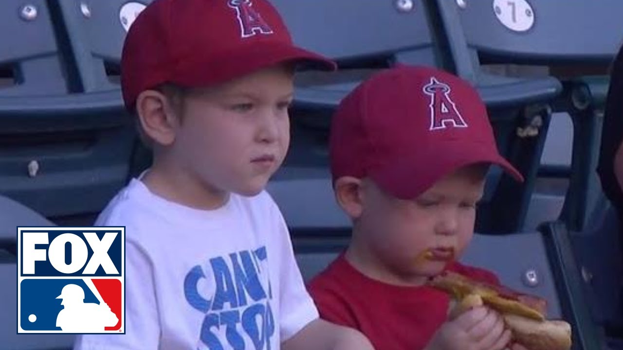 A young Angels fan as a rough time figuring out the best way to eat his hot dog.
