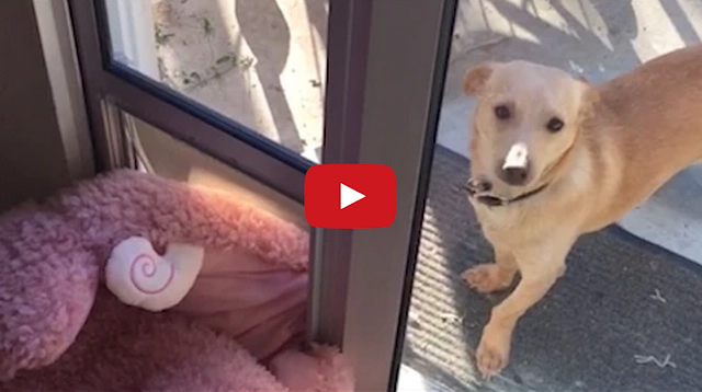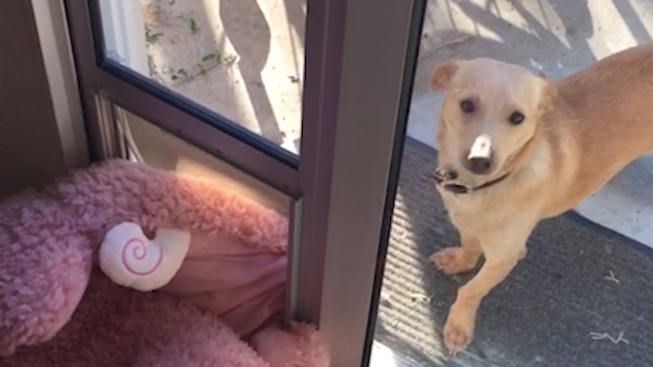 Juno the dog is hoping to enjoy a nice nap al fresco, but her plan hits a roadblock when she realizes her big pink bed won’t quite fit through the doggie door.