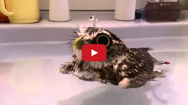 Trude the spotted little owl loves to leisurely float like a boat while taking baths in the sink.