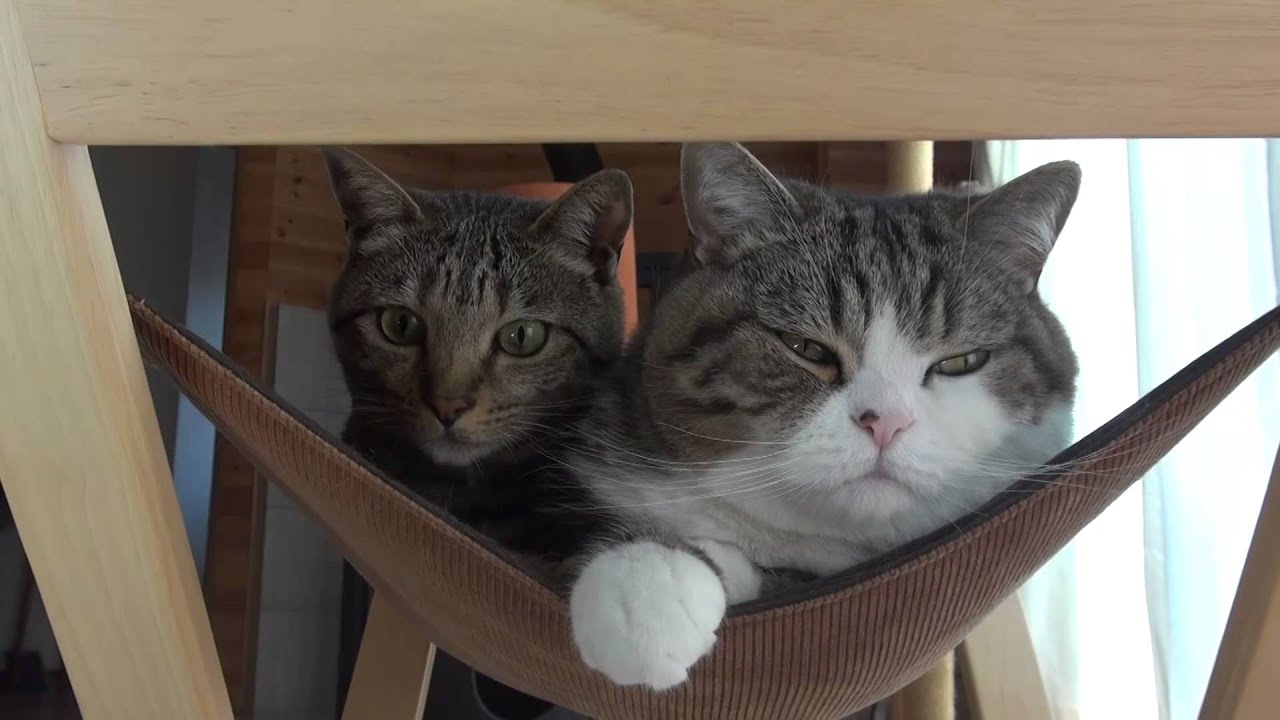Japanese Internet cat celebrity Maru and his feline housemate Hana realize that their new cat hammock isn’t quite big enough for the two of them (wait for it).