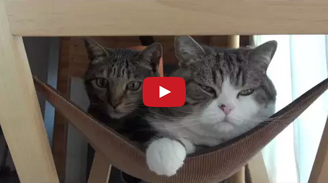 Japanese Internet cat celebrity Maru and his feline housemate Hana realize that their new cat hammock isn’t quite big enough for the two of them (wait for it).