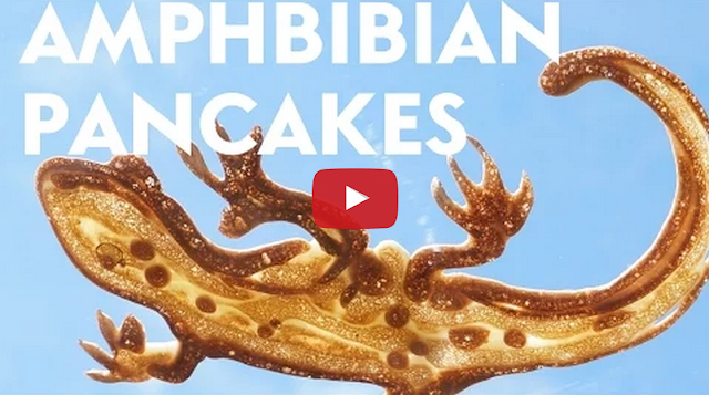 Dad, math teacher, and pancake artist Nathan Shields creates detailed pancake versions of four amphibians, including the fire-bellied newt, hellbender salamander, spotted salamander, and golden mantella frog.