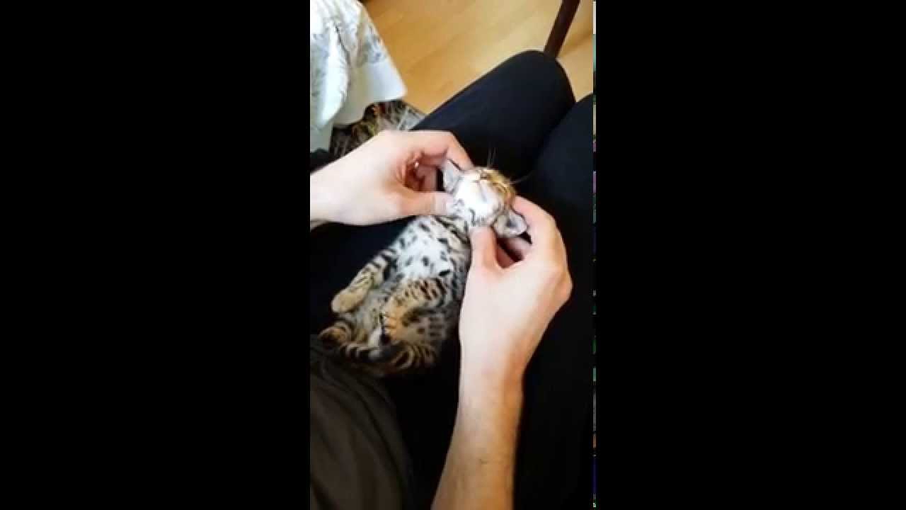 This tiny bengal kitten looks happy as can be (and a lot like Master Yoda) while her human gives her a relaxing head massage.