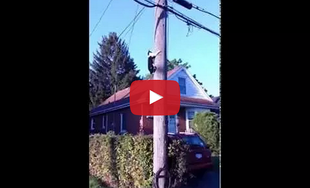 A man named Albert witnessed this real-life cat-and-mouse game happening between a house cat and a nimble squirrel on a telephone pole near his home.