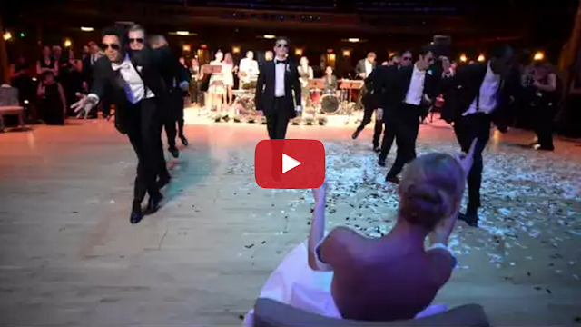 Professional dancer Kirk Henning, along with his eight groomsmen, surprised his bride Valerie, who’s also a professional dancer, with a choreographed dance medley to new and classic songs during their wedding reception at the CenterStage performing arts center in Richmond, Virginia.
