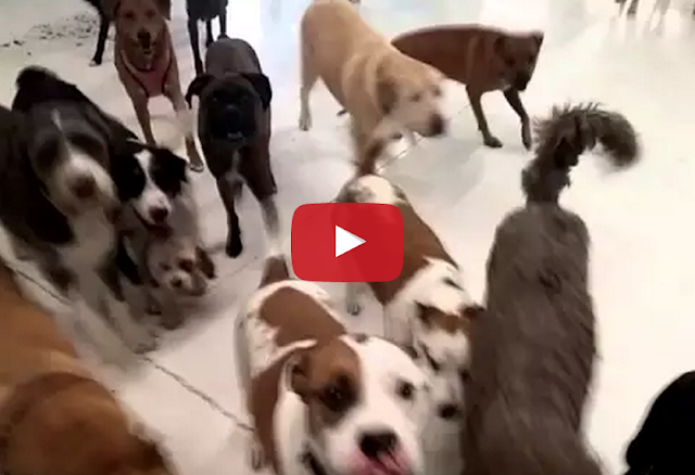 Nathan Adams works at doggie daycare center. In this video he shows what it’s like to be happily greeted by over two dozen dogs at once.