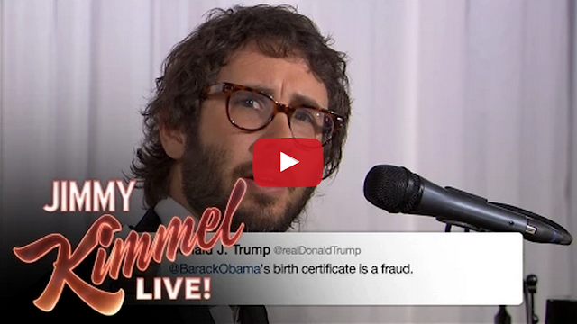 Late night host Jimmy Kimmel shares a (parody) promo for angel-voiced singer Josh Groban’s latest album, The Best Tweets of Donald Trump.