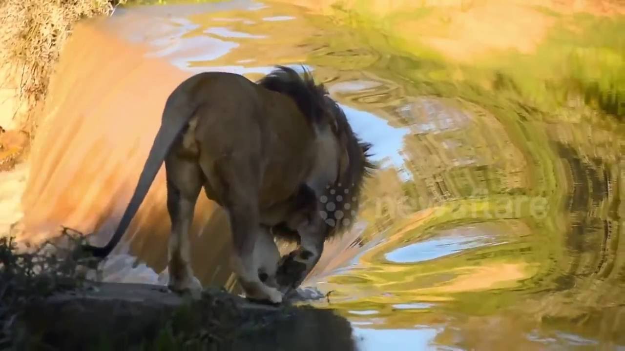Lion Slips and Falls Down Waterfall While Trying to Cross River