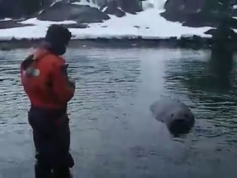 British researchers, doing an exploration in Antarctica, surprise a huge elephant seal who made his way onto one of their small boats.
