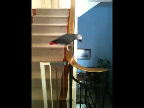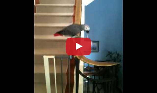 Stanley, the African grey parrot, has fun sliding down a long banister, then gets cheered on my his canine housemates at the end.