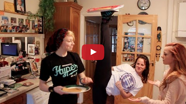 British martial artist and stuntwoman Chloe Bruce (brunette), her younger sister Grace Bruce (redhead) and their friend Paige Cerson (blonde) perform a series of crazy tricks and stunts while making pancakes in honor of Pancake Day.