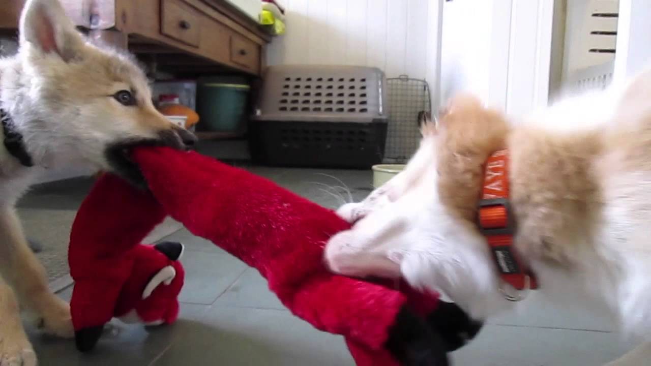 Wolf Puppy and Border Collie Puppy Play Tug-of-War