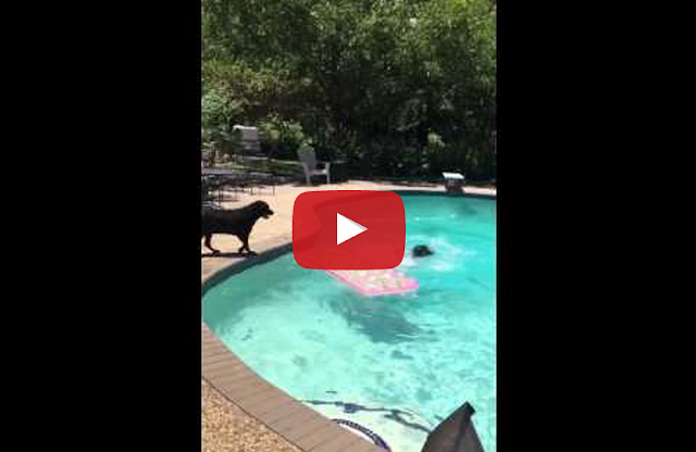 Jennifer Durham gets pounce attacked by a labrashark (her 9-month-old black lab named Jett) while floating on an inflatable lounger in a swimming pool.