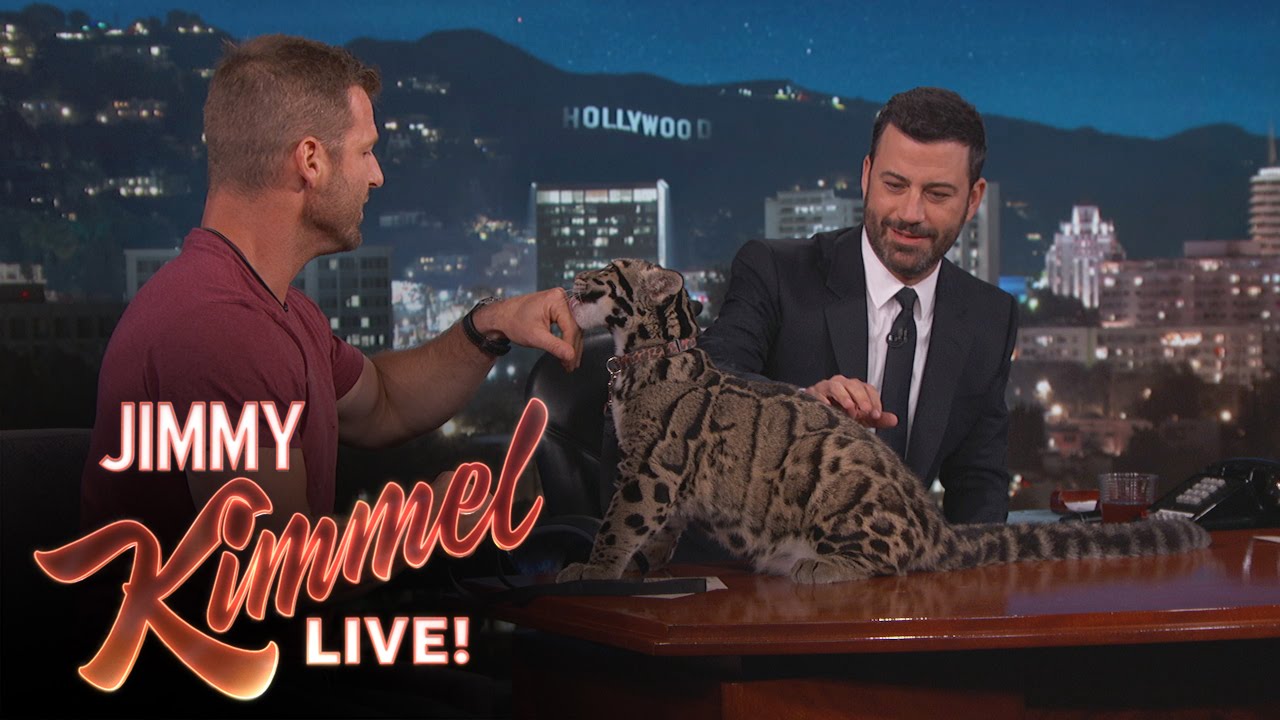 Animal expert and Animal Planet host Dave Salmoni returns to Jimmy Kimmel Live (previously) with another collection of exotic animals, including a Siberian tiger cub, an African crowned crane, a Fennec fox, and a cuddly clouded leopard cub.