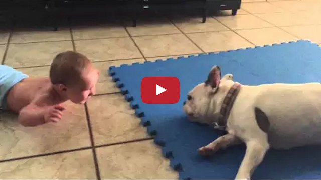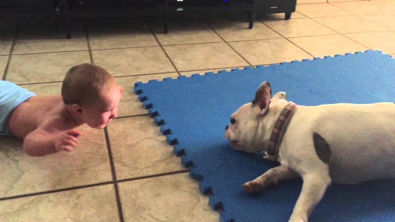 This six-month-old baby boy laughs hysterically while watching his canine sibling, Rupert, the French bulldog, excitedly spins in circles.